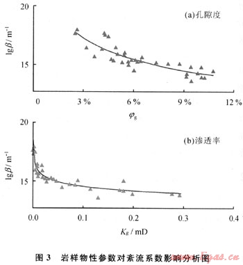 高速非達西滲流特征是多孔介質(zhì)中氣體滲流普遍存在的特殊滲流現(xiàn)象。不同的物性參數(shù)條件下高速非達西滲流效應對氣體滲流的影響程度不同,紊流系數(shù)(β)的大小直觀反映了高速非達西對氣體滲流的影響程度。物性參數(shù)與紊流系數(shù)關(guān)系實驗結(jié)果見圖3。總體而言,隨著氣相有效孔隙度及氣相有效滲透率增加,紊流系數(shù)逐漸減小,表明儲層物性越差高速非達西滲流效應越明顯。
