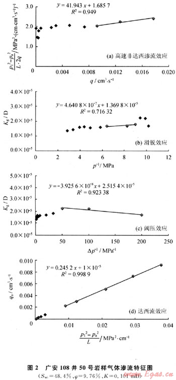 國內(nèi)外長期的滲流實驗研究確認了氣體特殊滲流效應對應的實驗現(xiàn)象,并根據(jù)大量的實驗數(shù)據(jù)建立了相應的數(shù)學描述關(guān)系式[2~4]。2008年馮曦等根據(jù)單相氣體不同滲流運動方程建立了對應的滲流效應診斷方法,提高了診斷精度[5~6]。筆者以上述方法為基礎(chǔ),對所有實驗樣品的滲流機理進行診斷分析。