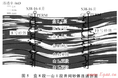 由此可見(jiàn),應(yīng)用儲(chǔ)層三維地質(zhì)模型,可以準(zhǔn)確地預(yù)測(cè)有效儲(chǔ)層的規(guī)模及其空間分布,通過(guò)沿任意方向切取垂向和水平剖面,可以對(duì)儲(chǔ)層進(jìn)行定量評(píng)價(jià)。圖5為通過(guò)儲(chǔ)層滲透率三維模型切取的過(guò)井剖面,從圖中可以直觀地看出儲(chǔ)層砂體的井間連通或者尖滅情況,定量分析儲(chǔ)層物性的橫向變化,準(zhǔn)確地界定儲(chǔ)層砂體的幾何形態(tài)。如S38-16井生產(chǎn)近半年,關(guān)井63d,在盒8下亞段1層第10號(hào)砂體測(cè)得地層壓力為19.7MPa,而S38-16-4井在同一地層的8號(hào)砂體地層壓力為29.3MPa,反映兩口井砂體不連通或物性差別極大,與儲(chǔ)層地質(zhì)模型基本吻合。通過(guò)工區(qū)內(nèi)16口測(cè)壓井、2個(gè)井組干擾試驗(yàn)以及投產(chǎn)井生產(chǎn)動(dòng)態(tài)特征,證實(shí)了所建立的三維地質(zhì)模型精度較高,客觀地反映了有效儲(chǔ)層空間分布,也表明所提出的建模方法對(duì)低滲透河流相儲(chǔ)層建模是有效的。