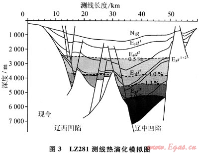 遼東灣地區(qū)有多個(gè)次級(jí)構(gòu)造帶,各凹陷烴源巖的演化程度有較大差異。為了進(jìn)一步揭示和刻畫其演化差異,在單井模擬的基礎(chǔ)之上,結(jié)合以往研究成果,從該區(qū)選擇了10條二維剖面(圖1),應(yīng)用EASY%Ro模型進(jìn)行埋藏史、熱史和成熟度演化史模擬。以測線LZ281剖面成熟度演化史模擬為例(圖3),模擬結(jié)果表明:整體來看,對(duì)于同一層位來說,與遼中凹陷相比,遼西凹陷的熱演化程度較低。遼東灣的生烴門限約為深度2500m(Ro>0.5%),遼中凹陷東二下段和遼西凹陷的東三段烴源巖進(jìn)入生烴門限。遼東灣地區(qū)的排烴高峰(0.8%<Ro<1.0%)為深度3400~3600m,遼中凹陷東三段下部及沙一、二段烴源巖和遼西凹陷沙三段烴源巖處于排烴高峰階段,產(chǎn)生大量液態(tài)烴。深度超過4400m處,遼中凹陷大部分沙三段烴源巖進(jìn)入高成熟階段(Ro>1.3%),以生成凝析氣、濕氣為主;沙四段烴源巖Ro>2.0%,進(jìn)入過成熟階段??梢姡F(xiàn)今遼西凹陷東三段-沙三段主力烴源巖主要處于生、排烴高峰,生成大量油氣,是目前遼西凹陷及其周圍地區(qū)內(nèi)一系列大中型油氣田發(fā)現(xiàn)的物質(zhì)基礎(chǔ);而遼中凹陷熱演化程度較高,除東下段和沙一二段烴源巖還處于生油階段,沙三段烴源巖主要處于生氣階段,是遼中凹陷和遼西低凸起發(fā)現(xiàn)大規(guī)模凝析氣田和油田的物質(zhì)基礎(chǔ)。