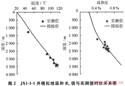 目前對(duì)有機(jī)質(zhì)生烴史模擬,已建立了化學(xué)動(dòng)力學(xué)模型和實(shí)驗(yàn)產(chǎn)烴率模型,以及成熟度的各種計(jì)算模型(TTI、EASY%Ro等)。本次研究應(yīng)用EASY%R。模型[8~11]。該方法模擬生烴史基于烴源巖埋藏史與熱史,在此基礎(chǔ)上模擬鏡質(zhì)體反射率隨時(shí)間的變化;然后通過Ro值的演變確定有機(jī)質(zhì)成熟的時(shí)間與深度或溫度,進(jìn)而劃分烴源巖生烴門限和演化階段。