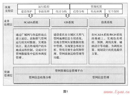應(yīng)用層——輸配管網(wǎng)數(shù)據(jù)采集與監(jiān)視控制系統(tǒng)(SCADA系統(tǒng))、地理信息系統(tǒng)(GIS系統(tǒng))、仿真系統(tǒng)為一體的管網(wǎng)資源信息管理平臺(tái)。
