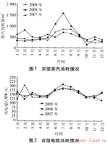 賓館用能有蒸汽、天然氣、電。由于備用燃?xì)忮仩t一般情況下不運(yùn)行,烹飪耗天然氣量根據(jù)入住率變化較大,因此本文不考慮天然氣的消耗。圖1、2分別為2007—2009年蒸汽和電的消耗情況。