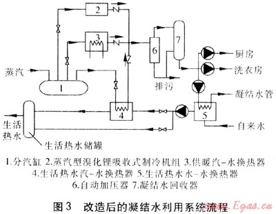 ③ 冬季蒸汽凝結(jié)水溫度達(dá)到90℃以上,且凝結(jié)水量較大,僅供給洗衣房使用是不合理的,還可以用于加熱生活熱水、廚房洗滌用水等,這樣將節(jié)省大量能源。改造后的凝結(jié)水利用系統(tǒng)流程見圖3。經(jīng)供暖汽-水換熱器、生活熱水汽-水換熱器換熱后的高溫凝結(jié)水經(jīng)單向閥流向自動(dòng)加壓器,經(jīng)加壓后送往凝結(jié)水回收器中,然后送到廚房、洗衣房以及生活熱水水-水換熱器中制備生活熱水。當(dāng)生活熱水需求量較小時(shí),可單獨(dú)采用生活熱水水-水換熱器,需求量較大時(shí)可同時(shí)采用兩臺(tái)換熱器。