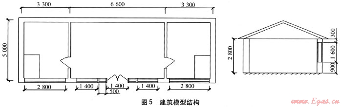 以抽樣調(diào)查得到的典型建筑為模型,確定建筑模型的建筑面積為66m2,坐北朝南,建筑窗墻比為0.52,體形系數(shù)為0.37,建筑模型結(jié)構(gòu)見圖5,圖中數(shù)值單位為mm。圍護(hù)結(jié)構(gòu)的傳熱系數(shù)見表1。按上述建筑結(jié)構(gòu)進(jìn)行耗熱量計(jì)算,室內(nèi)供暖設(shè)計(jì)溫度按14℃計(jì)算,得到單位建筑面積耗熱量為131W/m2,散熱器供暖系統(tǒng)供、回水溫度取80、60℃,地板輻射供暖系統(tǒng)供、回水溫度取55、45℃。