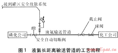 本項(xiàng)目在液氨長(zhǎng)距離輸送管道的起點(diǎn)磷化公司廠區(qū)內(nèi)設(shè)置球閥1個(gè),且為了保證出廠壓力及預(yù)防管道破損等事故,安裝了安全自動(dòng)切斷閥1個(gè),閥后設(shè)安全放散閥組1套,連接到廠區(qū)罐區(qū)內(nèi)的安全放散系統(tǒng);為控制管道的末端壓力,且為保證將來(lái)檢修方便,在終點(diǎn)化工公司廠區(qū)內(nèi)設(shè)置截止閥和球閥各1個(gè)。工藝流程見(jiàn)圖1。