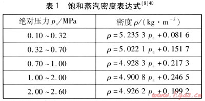 飽和蒸汽不同于理想氣體,不能通過(guò)氣體狀態(tài)方程來(lái)計(jì)算其密度;也不同于過(guò)熱蒸汽,不能用以溫度和壓力為自變量的近似公式來(lái)計(jì)算其密度;只能用以溫度或壓力為自變量的近似公式來(lái)計(jì)算其密度。以壓力為函數(shù)的飽和蒸汽密度表達(dá)式見(jiàn)表1,飽和蒸汽密度表達(dá)式在相應(yīng)的壓力范圍內(nèi)精度比較高。
