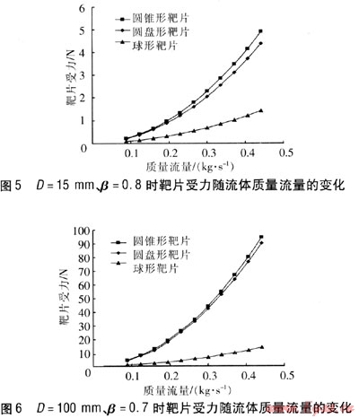 不同D、β下3種靶片受力隨流體質(zhì)量流量的變化見(jiàn)圖5、6。由圖5、6可知,在相同質(zhì)量流量下,靶片受力由尺到小依次是圓錐形、圓盤(pán)形、球形。不同質(zhì)量流量下流體流經(jīng)3種靶片的壓力損失見(jiàn)表1、2。由表1、2可知,隨著質(zhì)量流量的增加,流體流經(jīng)靶片的壓力損失也逐漸增加。相同質(zhì)量流量時(shí),流經(jīng)圓盤(pán)形、圓錐形靶片的壓力損失接近,但大于球形。在D、β相同的情況下,圓錐形靶片與流體接觸的面積較大,而圓盤(pán)形靶片后部流體分離嚴(yán)重,因此二者對(duì)流體的擾動(dòng)比較大,靶片受力較大,因渦流導(dǎo)致的壓力損失也相對(duì)較大。球形表面光滑,當(dāng)流體通過(guò)時(shí),狀態(tài)改變緩慢,對(duì)流體影響較小,因此其受力與流體壓力損失相對(duì)較小。因此,若要求靈敏度高(小流量)時(shí),希望靶片受力大些,宜選用圓盤(pán)形靶片和圓錐形靶片。若要求靈敏度低(大流量)時(shí),宜選用球形靶片。
