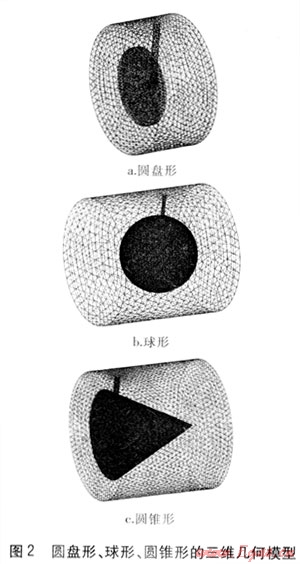 本文主要對(duì)圓盤(pán)形、球形、圓錐形靶片進(jìn)行模擬分析。由FLUENT前處理軟件GAMBIT建立的這3種形狀靶片的三維幾何模型見(jiàn)圖2,流體的流動(dòng)方向?yàn)樽宰笙蛴摇?/span>