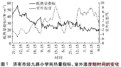 以濟(jì)南市經(jīng)九路小學(xué)為例,測試日期為2010年1月20日至28日,耗熱量指標(biāo)、室外溫度隨時間的變化見圖1。