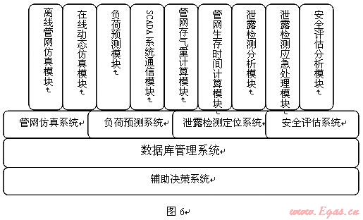 輔助決策系統(tǒng)一辦包含管網(wǎng)仿真系統(tǒng)、負(fù)荷預(yù)測(cè)系統(tǒng)、泄露檢測(cè)定位系統(tǒng)、安全評(píng)估系統(tǒng)等系統(tǒng)組成,輔助決策系統(tǒng)結(jié)構(gòu)見(jiàn)圖6: