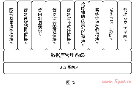 GIS系統(tǒng)主要由圖形基本操作模塊、管網(wǎng)設(shè)施管理模塊(設(shè)備臺(tái)賬管理)、管網(wǎng)制圖系統(tǒng)、管網(wǎng)綜合查詢系統(tǒng)模塊、管網(wǎng)綜合統(tǒng)計(jì)模塊、搶修輔助決策系統(tǒng)模塊、系統(tǒng)維護(hù)管理模塊、WEB GIS子系統(tǒng)、移動(dòng)GIS子系統(tǒng)(PDA)等組成。功能模塊見(jiàn)圖3: