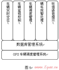 GPS系統(tǒng)主要功能有車輛實(shí)時(shí)定位、車輛監(jiān)視控制、車輛調(diào)度管理、車輛報(bào)警處置、短信語(yǔ)音通信等。功能結(jié)構(gòu)見(jiàn)圖5: