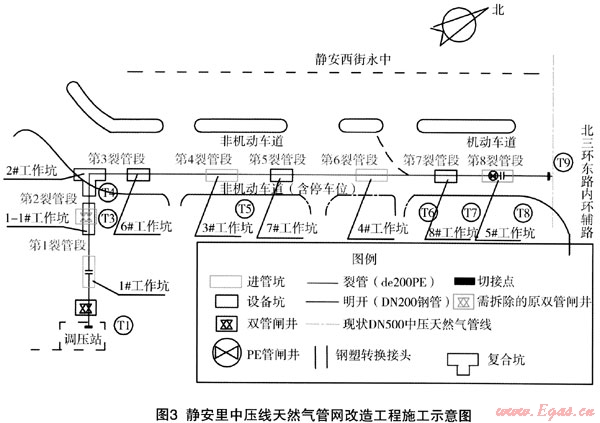 下面,以靜安里中壓線天然氣管網(wǎng)改造工程為實例,具體介紹一下裂管施工技術(shù)在燃氣管線改造丁程中的應用。