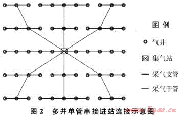 此種串接方式優(yōu)化了管網(wǎng)布置,縮短了采氣管線長度,增加了集氣站轄井?dāng)?shù)量,降低了管網(wǎng)投資,減少了對(duì)生態(tài)環(huán)境的破壞,適應(yīng)低壓、低產(chǎn)的煤層氣田大規(guī)模開發(fā)。