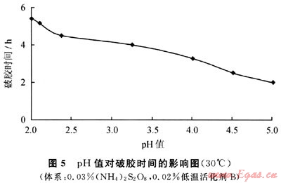 將PAM濃度為0.4%,ZrOCl2為1%的溶液按100:3.5的配比混合,加入相同濃度的氧化還原體系,使用2%HCI將體系pH值調(diào)至不同值,放入30℃水浴測(cè)得破膠時(shí)間(圖5)。