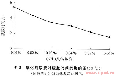 由圖3可以看出,在低溫活化劑濃度不變,氧化劑濃度對(duì)壓裂液凍膠破膠時(shí)間影響較大,破膠時(shí)間隨著氧化劑濃度的增加而減少。