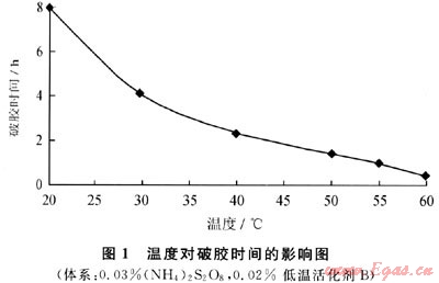 在高于50℃的條件下,過硫酸銨分解反應(yīng)所需要的能量由周圍環(huán)境提供,反應(yīng)能順利進(jìn)行;而在煤層溫度(20~40℃)時(shí),由于周圍環(huán)境不能很好提供過硫酸鹽分解所需的能量,過硫酸鹽的游離氧釋放速度大大降低,因而其破膠能力迅速下降。氧化還原體系是通過低溫活化劑劑引發(fā)過氧化物的自由基,在低溫下釋放出氧破壞凍膠結(jié)構(gòu),使大分子降解從而達(dá)到破膠的目的[4~5]。低溫活化劑與過硫酸銨作用為放熱反應(yīng),并且有一定的延遲釋放特性。
