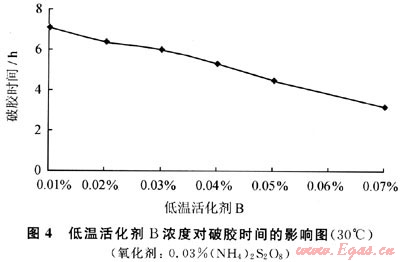將PAM濃度為0.4%,ZrOCl2為1%的溶液按100:3.5的配比混合,加入不同濃度的低溫活化劑B,加入調(diào)節(jié)劑A,放入30℃水浴測(cè)得破膠時(shí)間(圖4)。