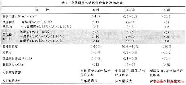 2 煤層氣選區(qū)評價參數(shù)標(biāo)準(zhǔn)