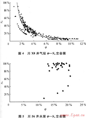 根據(jù)阿爾奇的經(jīng)典公式可以知道:如果儲層只含束縛水,在φ-Sw交會圖中的交會點呈近雙曲線分布規(guī)律,說明儲層只含束縛水,不含可動水,儲層為氣層(圖4);如交會點不呈近雙曲線分布規(guī)律,說明儲層不僅含束縛水,還含可動水,儲層為水層或氣水同層(圖5)。