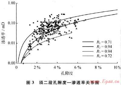 眾所周知,滲透率的大小主要取決于孔隙度的大小和孔隙的幾何形狀,通過對須二段大量的鑄體薄片觀察分類后,建立了與微裂縫發(fā)育程度有關(guān)的孔隙度與平均滲透率之間的關(guān)系(圖3),其中滲透性最好的是由黑色曲線代表,綠色曲線表示最為致密,橙紅色曲線表示在顯微鏡下可見孔隙連通性較差,未見或有極少微裂縫,喉道發(fā)育差;藍色曲線則代表有少許喉道或微裂縫連通,將測井曲線與之進行綜合標定后,可計算得到不同孔隙結(jié)構(gòu)及裂縫發(fā)育程度下的地層滲透率。