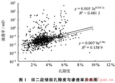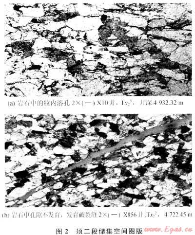 由須二段儲層孔隙度與滲透率的關(guān)系圖(圖1)可見,隨著孔隙度的增大滲透率有變好的趨勢,但孔滲相關(guān)性較差,這說明須二段儲層基質(zhì)孔滲相關(guān)性較好,同時儲層存在一些與孔隙空間關(guān)系較小的額外滲濾通道,這些滲濾通道使得須二段滲透率值的增加對孔隙度增加的依賴很小。由薄片鑒定可推斷新場須二段儲層的額外滲濾通道為裂縫(圖2)。工業(yè)氣流的產(chǎn)出對裂縫的依賴程度很高[1~3]。