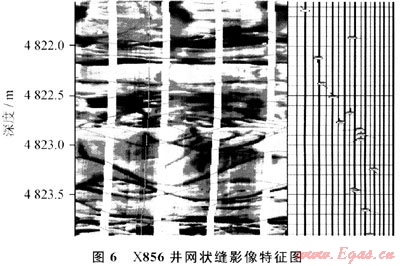 按聲電成像測圖像顏色的深淺,可以直觀、清晰地拾取裂縫發(fā)育的條數(shù)和裂縫的傾角,這是最有力的裂縫識別手段。通常成像測井分辨裂縫的類型有:高角度縫、低角度縫、網(wǎng)狀縫3大類,同時可以直觀顯示其有效性,圖6是X856井產(chǎn)層段裂縫成像測井圖,清楚地展示了裂縫的各類型。