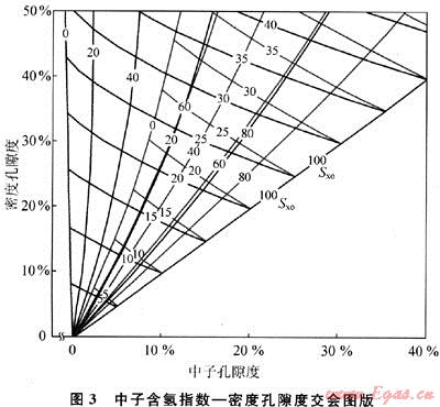 根據(jù)中子測井含氫指數(shù)和經(jīng)骨架密度校正的密度孔隙度,進入中子含氫指數(shù)密度孔隙度交會圖版(圖3),再根據(jù)儲層深度選擇相應的關系曲線族,則由交會點位置可得到地層孔隙度(φ)。由中子測井含氫指數(shù)及計算出的密度孔隙度,在此交會圖可查出其對應的地層孔隙度及沖刷帶含水飽和度(Sxo)。