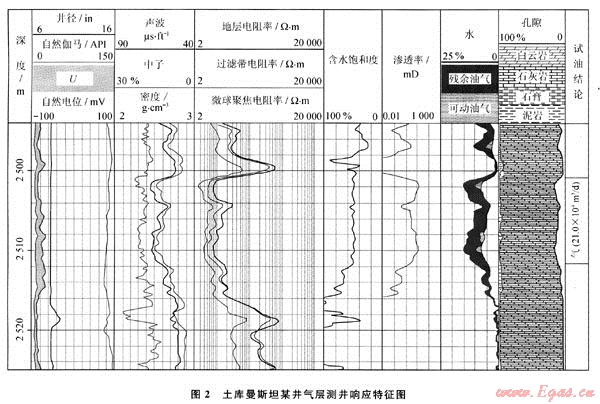 以往對儲層進行氣水或油氣判別時,主要基于天然氣的低含氫指數(shù)及挖掘效應,氣層視中子孔隙度降低,而聲波和密度視孔隙度增高,且其差別越大,越符合氣層特征。但在測井解釋中卻發(fā)現(xiàn)有些高產(chǎn)氣層的視中子孔隙度并不很低,而密度、聲波視孔隙度卻增大不多,故經(jīng)常導致氣水或油氣判別失誤[1~2]。如圖1和圖2所示,它們分別是蘇里格氣田某井產(chǎn)氣3.89×104m3/d氣層和土庫曼斯坦氣田某井產(chǎn)氣21.0×104m3/d氣層的測井響應特征,顯然高產(chǎn)氣層的視孔隙度關系反而更接近水層特征。