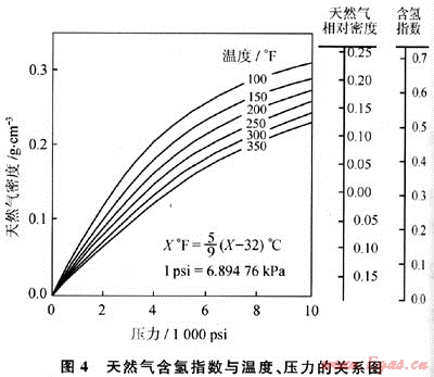 根據(jù)天然氣中子含氫指數(shù)與密度、壓力、溫度的關系(圖4),在已知中子含氫指數(shù)和溫度或已知密度和溫度的情況下,便可查出地層壓力。
