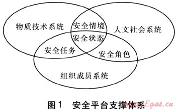 物質(zhì)技術(shù)系統(tǒng)、人文社會系統(tǒng)和組織成員系統(tǒng)3個集合的交叉構(gòu)成了3種聯(lián)系,形成安全情境、安全任務、安全角色和安全狀態(tài)4個交集。其中物質(zhì)技術(shù)系統(tǒng)與人文社會系統(tǒng)的交集構(gòu)成了管道燃氣企業(yè)所處的軟環(huán)境和硬環(huán)境,稱為安全情境。人文社會系統(tǒng)與組織成員系統(tǒng)的交集決定了管道燃氣企業(yè)中員工在安全生產(chǎn)中的身份,稱為安全角色。物質(zhì)技術(shù)系統(tǒng)與組織成員系統(tǒng)的交集劃定了組織成員在生產(chǎn)中所擔負的責任,稱為安傘任務。物質(zhì)技術(shù)系統(tǒng)、人文社會系統(tǒng)和組織成員系統(tǒng)三者的交集成為管道燃氣企業(yè)的安全狀態(tài)。安全平臺支撐體系見圖1。