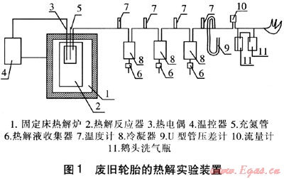 固定床熱解爐由耐高溫不銹鋼材料制成,直徑為200mm,高度為350mm,功率為7.5kW。在固定床熱解爐內套有一個直徑為100mm,高度為150mm的熱解反應器,用以盛裝實驗樣品,反應器蓋上設有出氣管、充氮管和熱電偶。為使熱解氣中的可凝氣體充分冷凝下來,冷凝器采用3組U型套管式水冷冷凝器,在其底部裝有桃形分液漏斗,接受冷凝下來的熱解油,每組冷凝器的進出口均設有溫度測點。廢舊輪胎的熱解過程在密閉、微正壓的條件下進行,產生的氣體中不含有毒物質,因此將去除可凝氣體后的不凝結氣體經過流量計后,排出室外燃燒。在冷凝器和流量計之間安裝了U型管壓差計,以便觀察實驗過程中系統(tǒng)內的壓力變化情況。