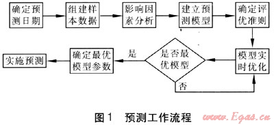 其工作過程如下:分析當(dāng)前需要預(yù)測日期前幾天負(fù)荷及歷史同期負(fù)荷變化情況,實(shí)時分析近期主要影響因素,作為模型輸入變量。對建模樣本數(shù)、是否考慮星期及節(jié)假日影響、模型主要變量數(shù)及模型結(jié)構(gòu)參數(shù)等尋優(yōu)。相當(dāng)于建立廠一系列不同的模型,根據(jù)歷史預(yù)測結(jié)果與實(shí)際結(jié)果的誤差大小確定評優(yōu)準(zhǔn)則及相應(yīng)的權(quán)值,由式(3)計(jì)算得出誤差平方和最小時對應(yīng)的預(yù)測模型參數(shù),再以評估確定的最佳模型進(jìn)行預(yù)測。當(dāng)預(yù)測結(jié)果的真值出現(xiàn)后,進(jìn)一步對預(yù)測結(jié)果進(jìn)行后評價及誤差統(tǒng)計(jì),為下一步預(yù)測時確定或修正評優(yōu)準(zhǔn)則提供依據(jù)。預(yù)測工作流程見圖1。