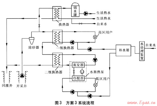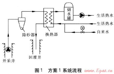 天津市南開區(qū)某住宅小區(qū)擬建兩座高層公寓,規(guī)劃建筑面積約11×104m2。在該小區(qū)內(nèi),現(xiàn)有兩眼奧陶系地?zé)峋?。最初,開發(fā)商只要求利用地?zé)豳Y源解決小區(qū)生活熱水供應(yīng)。設(shè)計單位考慮到節(jié)能、環(huán)保,為開發(fā)商提供了3種地?zé)豳Y源利用方案,希望地?zé)豳Y源能夠得到充分合理的利用。