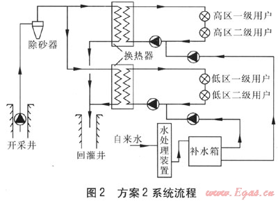方案2,僅利用地?zé)崴?,生活熱水由電熱水器制備。建筑物分為高區(qū)、低區(qū)供暖系統(tǒng),由于地?zé)峋鏊疁囟葹?0℃,因此宜采用地板輻射供暖系統(tǒng)。為充分利用地?zé)豳Y源,熱用戶采用兩級串聯(lián)形式,以降低回水溫度,即降低地?zé)嵛菜疁囟?。一級用戶供、回水溫度?0、40℃,二級用戶供、回水溫度為40、30℃,系統(tǒng)流程見圖2。方案2需在井口附近建1座占地面積為160m2的熱力站,地?zé)崴昧繛?41t/h,回灌溫度為33℃,總用電負(fù)荷為101kW,工程造價約265×104元。