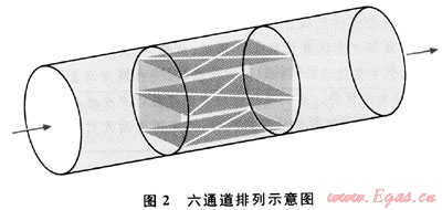 1) 與三、四聲道流量計(jì)相比,以特別方式排列的六聲道超聲波流量計(jì)有以下的決定性優(yōu)點(diǎn):①抗干擾性。根據(jù)高斯-切比雪夫(Gauss-Chebyshev)理論排列聲道,并且聲道相互交叉,使流量計(jì)很大程度上不受氣體流型的影響。因此,可以不需要整流器甚至在氣體流動(dòng)受到渦流、不對(duì)稱等干擾的情況下也可以實(shí)現(xiàn)高精度的測(cè)量。②冗余性。如果其中任何一個(gè)或兩個(gè)聲道失效,六聲道流量計(jì)將不會(huì)失去計(jì)量能力,失效的聲道可以通過重新復(fù)值來得到恢復(fù)。
