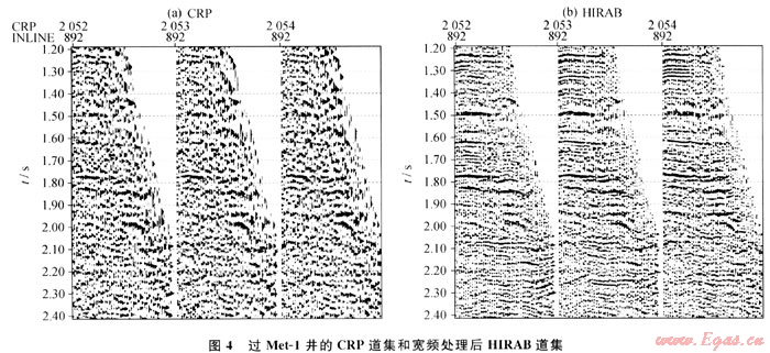 對保幅去噪的CRA道集進行寬頻處理,得到保幅寬頻高分辨率處理的HIRAB道集。圖4為過Met-1井(中間道集)的CRP道集和寬頻處理后的HIRAB道集??梢钥闯觯篐IRAB道集的分辨率大大提高,并且其信噪比亦明顯增強;兩種道集的波組關系與CRP道集一致。表明HIRAB具有很好的保幅性能。