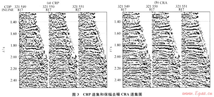 對包含中間道集的3個CRP道集進行保幅去噪,得到圖3中去噪后的CRA道集。從圖中可見,其信噪比明顯提高,波組關系沒有發(fā)生變化,道間的能量關系也未變。