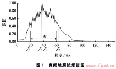 在地震信號有效頻帶內(nèi),設頻寬為df、主頻為fd、視主頻(地震剖面上能夠看到的主頻)為fv、振幅衰減為0.4的最低有效頻率(有效頻帶低頻)為fl、振幅衰減為0.4的最高有效頻率(有效頻帶高頻)為fh。則有效頻帶的頻寬為: