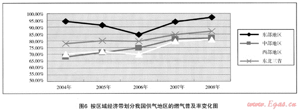 (1) 我國(guó)東部地區(qū)的燃?xì)馄占奥士傮w上高于其它地區(qū),其次為東北三省,中部和西部地區(qū)差別較少。西部地區(qū)有資源優(yōu)勢(shì),2005年前,普及率較中部地區(qū)略高,但2006年后,中部地區(qū)又略高于西部地區(qū),證明燃?xì)馄占奥蕪目傮w上看與地區(qū)的經(jīng)濟(jì)發(fā)展關(guān)系較大,其次才是資源因素。