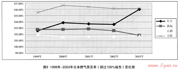 日本東京、新潟、京都、大阪1999年—2003年的燃?xì)馄占奥?,?jiàn)表3,變化狀況可見(jiàn)圖9。