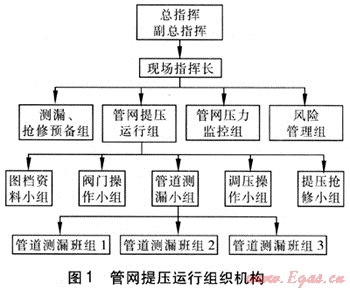 管網(wǎng)提壓運行指揮部由公司分管運行副總經(jīng)理任總指揮,分管工程副總經(jīng)理任副總指揮。指揮部下設管網(wǎng)提壓運行組、管網(wǎng)壓力監(jiān)控組、測漏、搶修預備組、風險管理組,另外公司相關職能部門如財務、采購、行政等管理部門按其職能給予配合。管網(wǎng)提壓運行組,按工作職能具體劃分為閥門操作小組、調(diào)壓操作小組、提壓搶修小組、管道測漏小組、圖檔資料小組等5個小組。管道測漏小組根據(jù)區(qū)域管網(wǎng)提壓長度及現(xiàn)有測漏人員和測漏儀器工具情況,可具體劃分為若干班組。管網(wǎng)提壓運行組織機構見圖1。