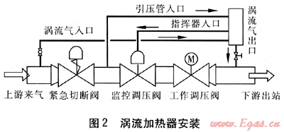 武漢西計量站來自西氣東輸淮武管道的天然氣壓力為5.0MPa,而下游供氣壓力約為1.4MPa。因此,在調(diào)壓分輸時,存在較大的節(jié)流。調(diào)壓橇采用“緊急切斷閥+監(jiān)控調(diào)壓閥+工作調(diào)壓閥”的調(diào)壓模式。監(jiān)控調(diào)壓閥的指揮執(zhí)行機構(gòu)主要由預調(diào)器和指揮器組成,預調(diào)器和指揮器中均存在節(jié)流。調(diào)壓橇工作時,由于指揮器的出口氣體溫度較低,且天然氣本身含有水或水合物,低溫時水容易冷凝成冰,堵塞指揮器閥口,造成調(diào)壓橇工作失效。原來主要采取電加熱的方法防止冰堵,現(xiàn)采用雙通道渦流加熱器取代電加熱器。該雙通道渦流加熱器設(shè)計的工作壓力為6.9MPa,試驗壓力為10.3MPa,加熱功率隨上下游壓比的變化而變化。雙通道渦流加熱器可以同時加熱2路天然氣,即1臺加熱器可以同時為2臺調(diào)壓閥指揮器加熱。渦流加熱器安裝見圖2。渦流加熱器的渦流氣出口溫度較低,因此渦流氣出口與下游管道之間的連接應(yīng)盡量短,出口管徑盡量大,彎頭盡量少(最好為直管段),以防止出口管道發(fā)生冰堵。在出口處需安裝一個節(jié)流閥來控制渦流氣流量,以控制加熱溫度。在渦流加熱器渦流氣進口處安裝一個直徑為12.7mm的小球閥,便于控制渦流加熱器的工作。從上游引壓管引入的高壓天然氣經(jīng)過渦流加熱器加熱后,進入調(diào)壓閥指揮器。在指揮器節(jié)流降溫后,天然氣的溫度仍然高于工作狀態(tài)下天然氣的水露點,有效地防止了冰堵。渦流加熱器安裝簡單,所有連接處均可采用卡套接頭連接[5]。