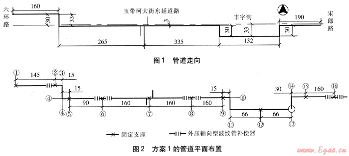 當(dāng)直管段熱補(bǔ)償方式采用外壓軸向型波紋管補(bǔ)償器時(shí),在直管段與彎曲管段連接處存在內(nèi)壓不平衡力,此處設(shè)置的固定支座稱為大推力固定支座。對(duì)于大管徑、高壓力的供熱管道,大推力固定支座結(jié)構(gòu)龐大,施工難度大,造價(jià)高。因此盡量減少大推力固定支座數(shù)量,就成為管系設(shè)計(jì)的一個(gè)重要課題。下面分析彎曲管段采用不同的熱補(bǔ)償方式對(duì)管系布置的影響。