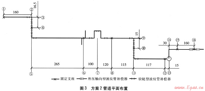 將方案1中節(jié)點(diǎn)1~15與方案2進(jìn)行對(duì)比可知,方案1共有固定支座10個(gè),其中2、5、9、15為大推力固定支座,而方案2在平面轉(zhuǎn)角處利用鉸鏈型波紋管補(bǔ)償器,加大補(bǔ)償段長(zhǎng)度,并在中間長(zhǎng)直管段上利用管道穿越障礙埋設(shè)較深的條件,設(shè)置豎向方形彎利用鉸鏈型波紋管補(bǔ)償器補(bǔ)償直管段熱伸長(zhǎng),減少了大推力固定支座數(shù)量。