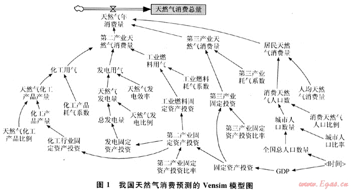 天然氣消費(fèi)是一個(gè)復(fù)雜的非線性系統(tǒng),影響因素眾多。目前大多數(shù)以計(jì)量模型為基礎(chǔ)的預(yù)測方法只能考慮到兩到三方面的影響因素[1~6]。為了能夠更準(zhǔn)確地預(yù)測我國天然氣消費(fèi)量,本文采取系統(tǒng)動(dòng)力學(xué)的方法,利用能夠考慮多因素的Vensim系統(tǒng)動(dòng)力學(xué)軟件進(jìn)行建模預(yù)測。在構(gòu)建天然氣消費(fèi)預(yù)測模型時(shí),從國民經(jīng)濟(jì)的產(chǎn)業(yè)結(jié)構(gòu)入手,將天然氣消費(fèi)系統(tǒng)分為第一產(chǎn)業(yè)天然氣消費(fèi)量、第二產(chǎn)業(yè)天然氣消費(fèi)量、第三產(chǎn)業(yè)天然氣消費(fèi)量以及居民生活天然氣消費(fèi)量4個(gè)子系統(tǒng)。同時(shí),考慮到整個(gè)社會(huì)的經(jīng)濟(jì)發(fā)展水平以及人口數(shù)量對(duì)天然氣消費(fèi)量的直接影響,將GDP和全國人口數(shù)量作為預(yù)測我國天然氣消費(fèi)量的重要因素。我國天然氣消費(fèi)的系統(tǒng)動(dòng)力學(xué)預(yù)測模型如圖1所示。