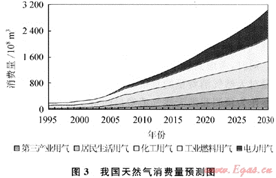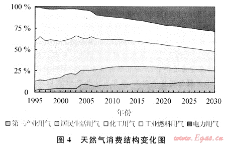 目前我國天然氣消費(fèi)主體為化工用氣與工業(yè)燃料用氣,發(fā)電用氣、第三產(chǎn)業(yè)用氣以及居民生活用氣的比例相對(duì)較小。隨著天然氣消費(fèi)總量的增長,消費(fèi)結(jié)構(gòu)也將發(fā)生很大的變化,如圖4所示。