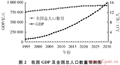 在所建立的系統(tǒng)動(dòng)力學(xué)模型中,GDP與總?cè)丝跀?shù)量是預(yù)測我國天然氣消費(fèi)的重要因素。在進(jìn)行各個(gè)子系統(tǒng)天然氣消費(fèi)預(yù)測時(shí),必須首先掌握這兩個(gè)因素的變化規(guī)律。根據(jù)國務(wù)院發(fā)展研究中心對(duì)我國經(jīng)濟(jì)增長前景的預(yù)測以及國家人口和計(jì)劃生育委員《國家人口發(fā)展戰(zhàn)略研究報(bào)告》的基本判斷,我國GDP的總量和未來全國總?cè)丝跀?shù)量預(yù)測結(jié)果如圖2所示。為了便于計(jì)算和對(duì)比,GDP以2005年不變價(jià)格計(jì)算。