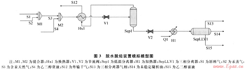由于低溫分離器等設(shè)備處于脫水脫烴裝置的作業(yè)流程內(nèi)部,不可能在裝置運(yùn)行過程中實(shí)時采樣,所以采用VMGSim軟件對脫水脫烴裝置中汞的分布進(jìn)行模擬(VMGSim軟件是目前國內(nèi)外唯一能對微量金屬元素在工業(yè)流程中的分布情況進(jìn)行模擬的專業(yè)軟件)。